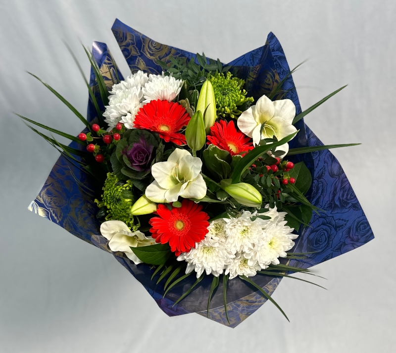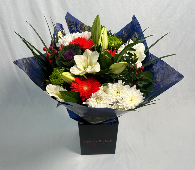 This festive red and white dark tone, has warmth when added to the snow white of the daisy with the pop of the ilex berries and dramatic twisted black willow perfectly complemented with the traditional green dot wrap, gifted in a beautiful gift box.