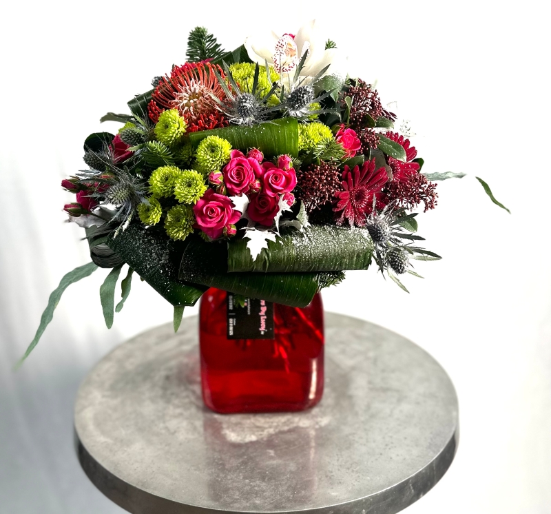 Created with winter colours in mind with the blue of the eryngium touch of blue on the orchids, the festive  traditional  colour combo of reds greens and pop of the frosted blue on the locospernum makes this one of our best sellers.