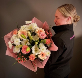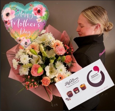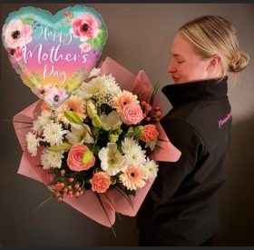 Classic shades of pastel colours. Meticulous hand tied with elegance in mind, using freshly cut pink lilies, white brassica, Sophia Loren peach roses, blush hypericum, white waxflower, cookies and cream germini, and baltica daisy, all nestled  between pitto and salal leaves. presented in our on-trend gift box, and a heart shaped balloon and a box of Lily O Brien chocolates.