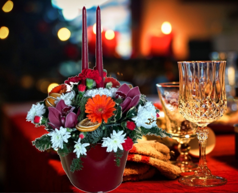 The Festive Frost Christmas candle arrangement combines elegant candles, dried oranges, and seasonal flowers, filling the air with a delightful holiday scent. Presented in a stylish blue pot adorned with a gold stag design, it’s a perfect blend of sophistication and festive charm.